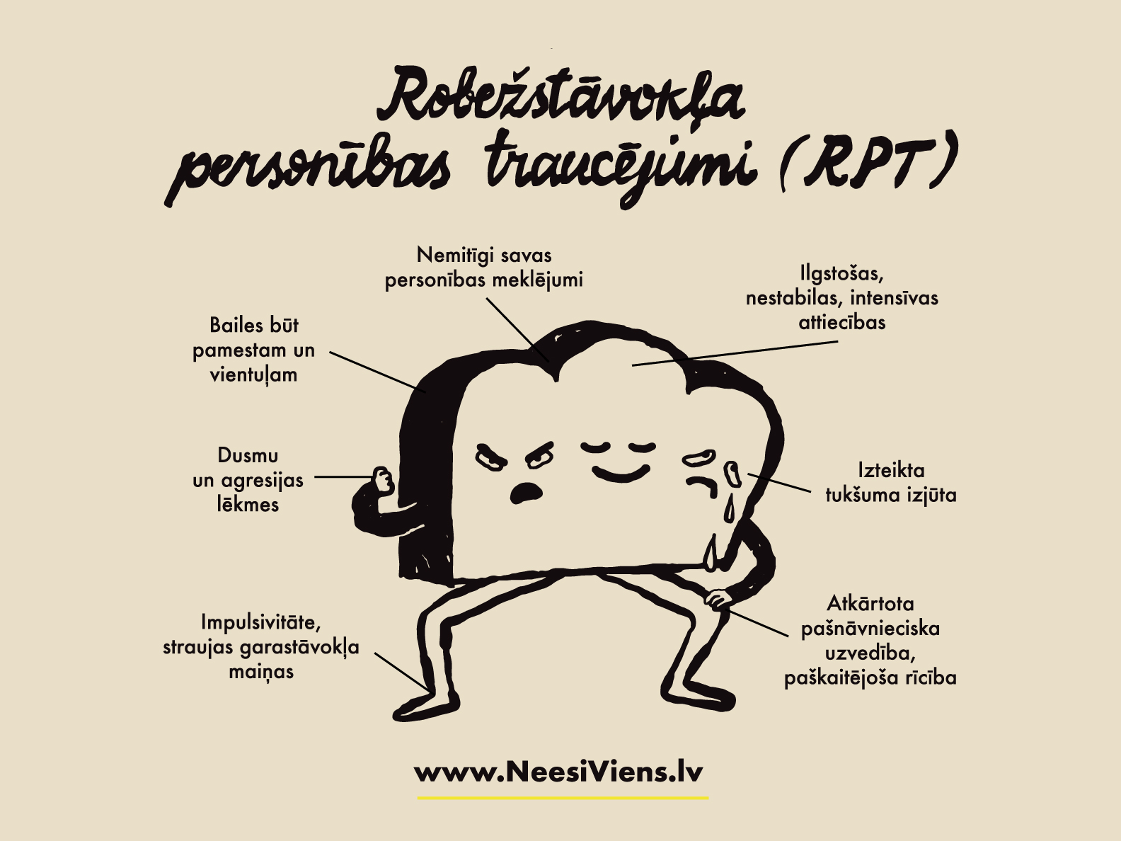 Izlasīju pāris populārzinātniskus rakstus, tad pārslēdzos uz akadēmisko datubāzi un studēju to, lai saprastu, ko mācās terapeiti, kad viņi mācās par šo traucējumu. Gribēju izprast, kas ar mani notiek ķermeņa un emociju līmenī, un tad ar šo informāciju operēt. Tas man ļoti palīdzēja. Nelīdu ārzemju grupās (sarunu forumos – red. piez.), kur pulcējas cilvēki ar robežstāvokļa diagnozi. Lasīju, cik citiem ir slikti un grūti. Latvijā nevienā grupā par mentālo veselību neesmu pamanījusi tādu tendenci, bet citviet cilvēki filmē video, kā viņi raud. Sapratu, ka negribu ar šiem cilvēkiem neko kopīgu. Negribu komunicēt un saistīties, jo tas man atgādina un rauj atpakaļ. Līdzīgi kā alkoholiķim ieiet dzērienu veikalā.