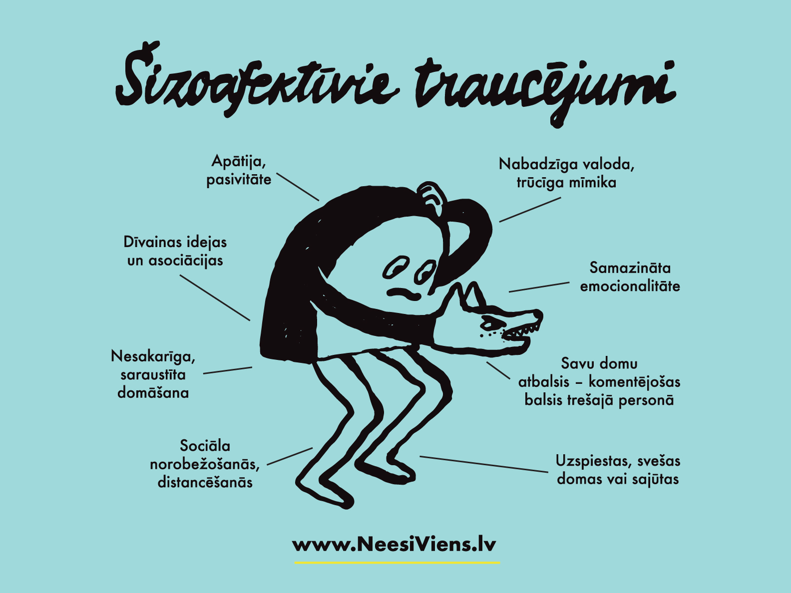 Tu neesi viens. Ir daudz cilvēku, kuriem ir problēmas un kuri tās risina. Nav jābaidās no terapeitiem. Nav jābaidās no psihiatriem. Nav jābaidās no zālēm, tās ir ļoti attīstījušās. Ja nepieciešamas zāles, tas nenozīmē, ka tu pārvērtīsies par zombiju, kuram vairs nav emociju, kurš nevar būt radošs. No tā nav jābaidās. Tas ir sarežģīti un grūti, bet palīdzība ir pieejama.